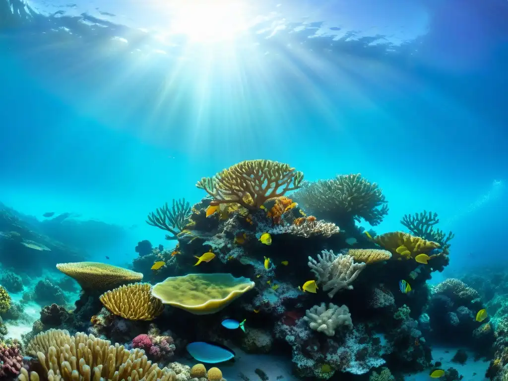 Un arrecife de coral vibrante, lleno de vida marina, bajo aguas turquesas cristalinas