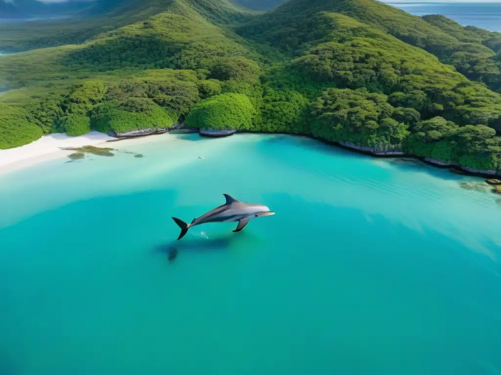 Imagen detallada de un ecosistema costero prístino, con aguas turquesas cristalinas, playas de arena blanca y vida marina