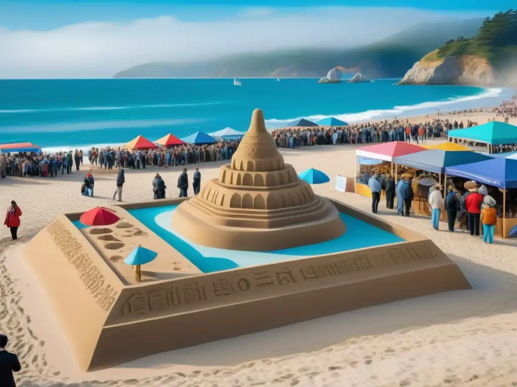 Festival de arte costero: vibrante escena con artistas locales y visitantes disfrutando de obras marítimas bajo coloridas carpas en la playa