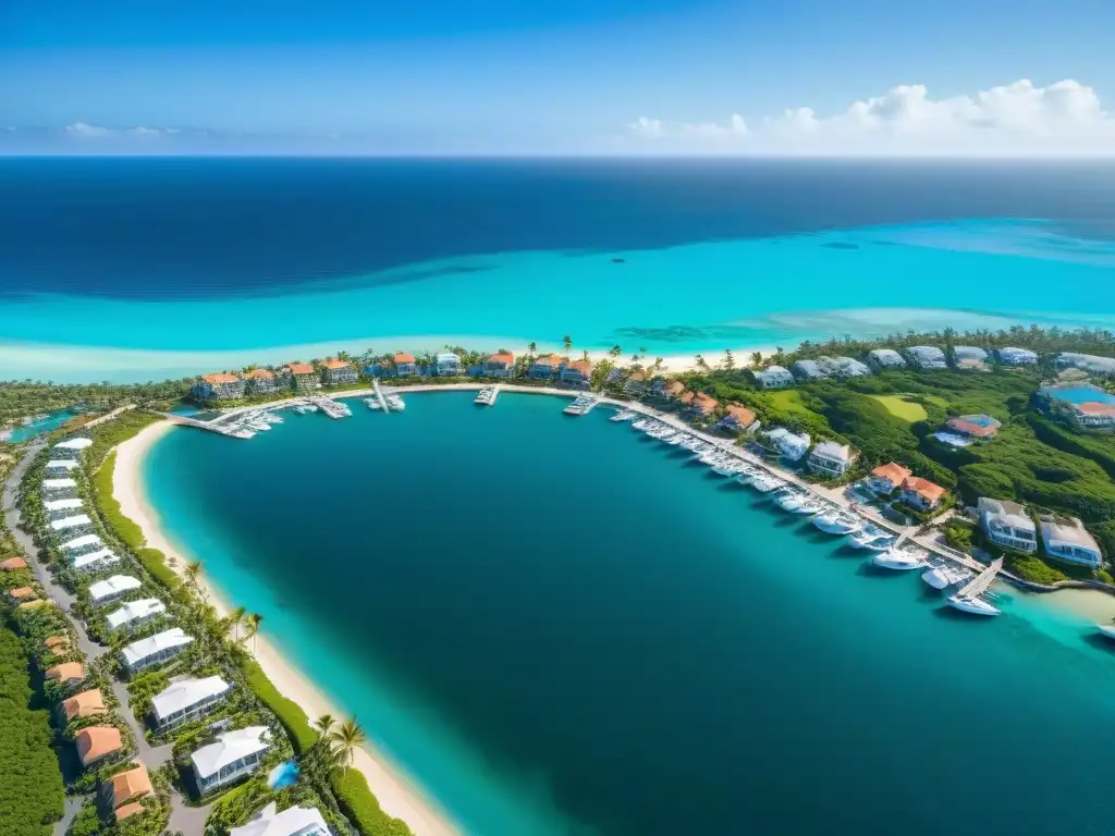 Un paraíso costero con casas coloridas, playas de arena y barcos en el puerto, ideal para hogar en la costa