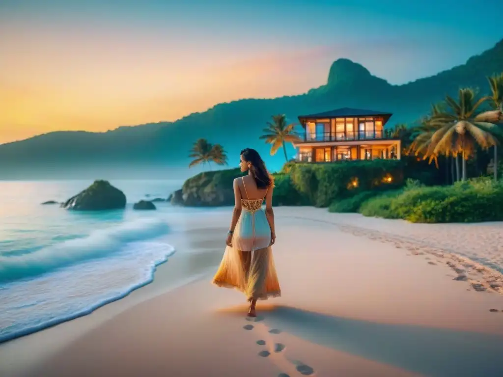 Propiedades costeras en realidad virtual: Villa de lujo en la playa al atardecer, con aguas cristalinas y palmeras meciéndose en la brisa cálida