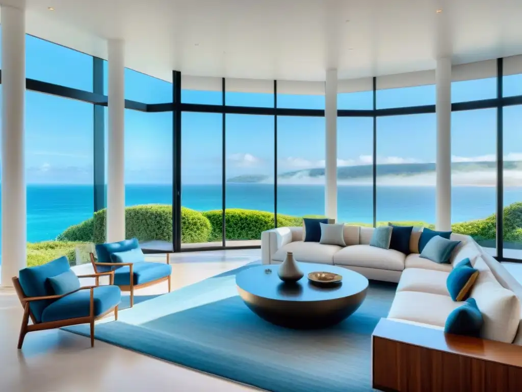 Un santuario costero con ventanas grandes que inundan la sala de luz natural y muestran el sereno paisaje marino