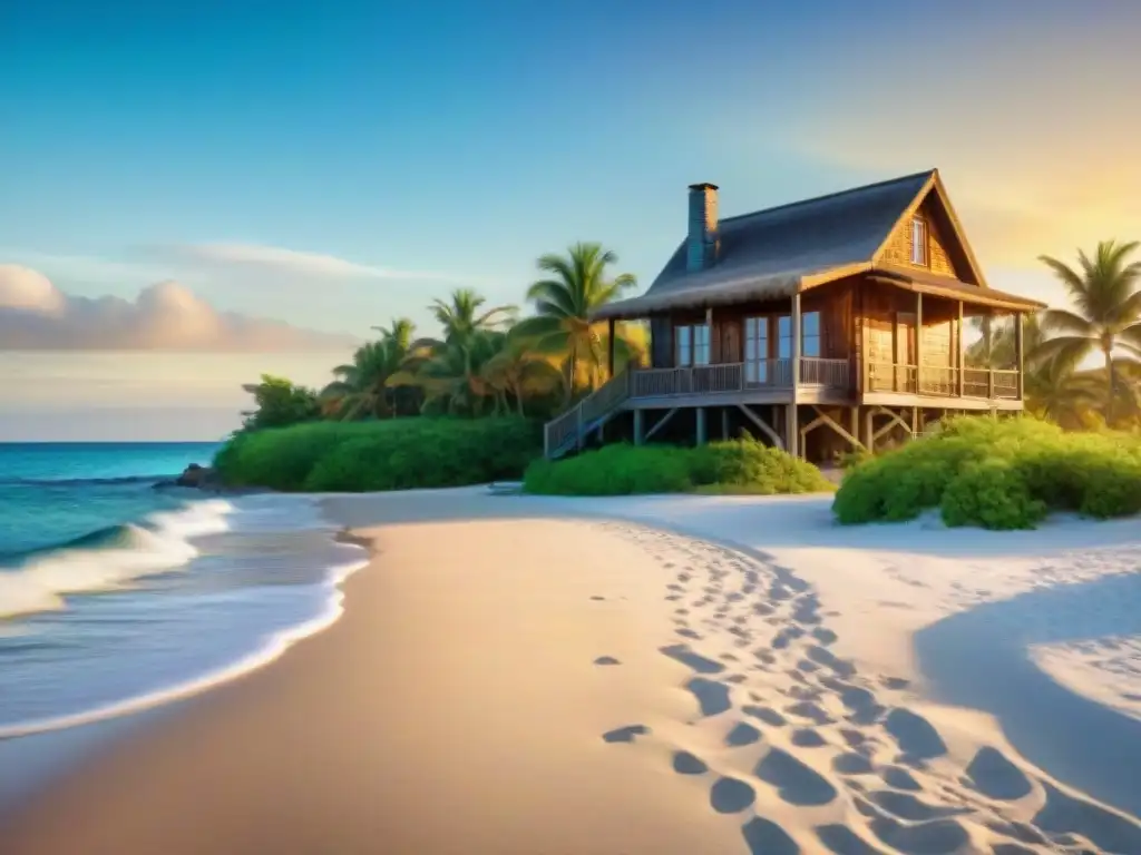 Encantadora cabaña playera rústica entre palmeras, con atardecer dorado sobre agua turquesa