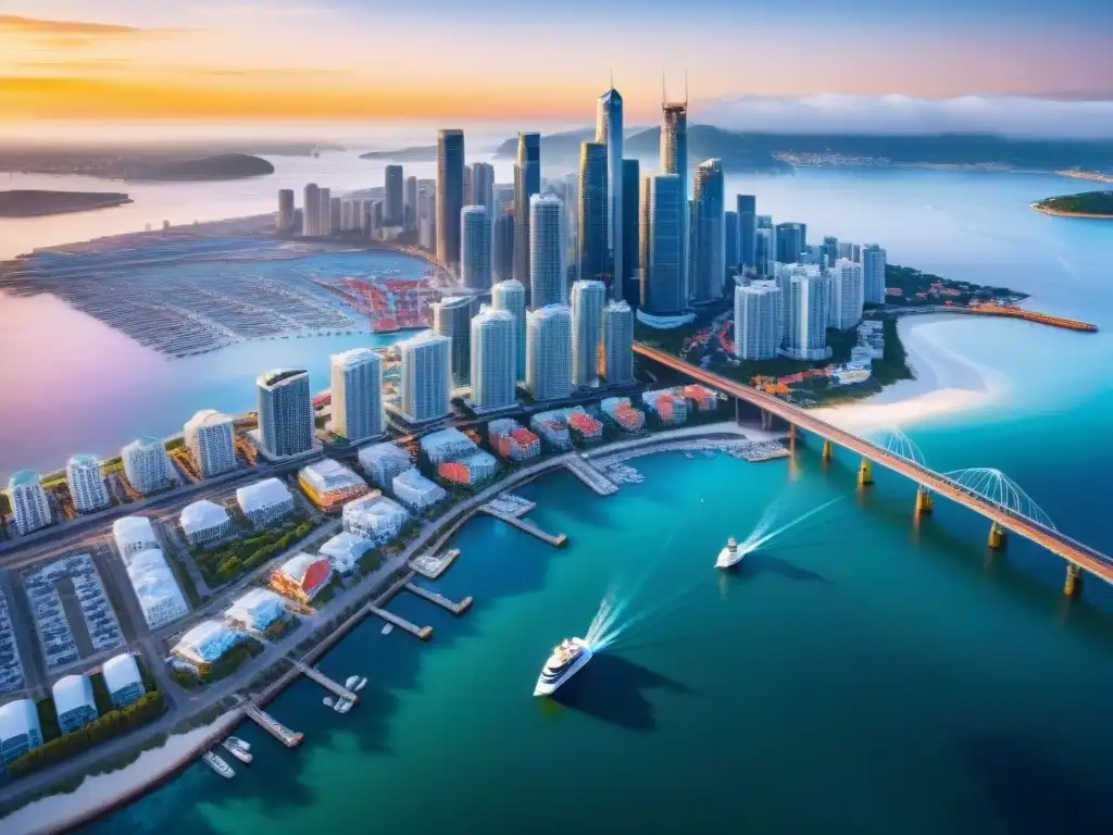 Vista aérea de ciudad costera con materiales innovadores en construcción sostenible