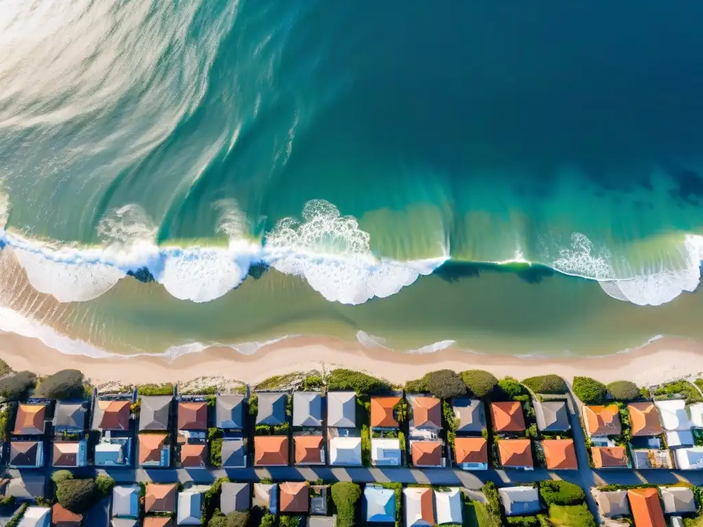Vista aérea impactante: casas lujosas en borde mar, vulnerables al impacto del cambio climático en propiedades costeras