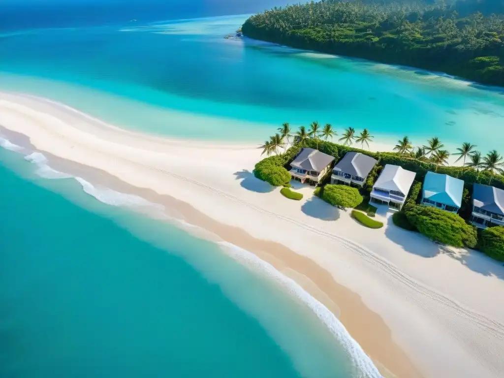 Playa paradisíaca con aguas turquesas, palmeras y casas lujosas