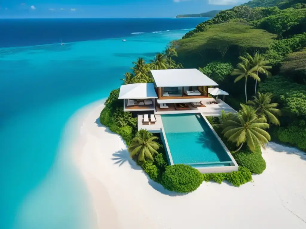 Invertir en propiedades costeras: Vista aérea de lujosa propiedad frente al mar, con playa de arena blanca y piscina infinita privada