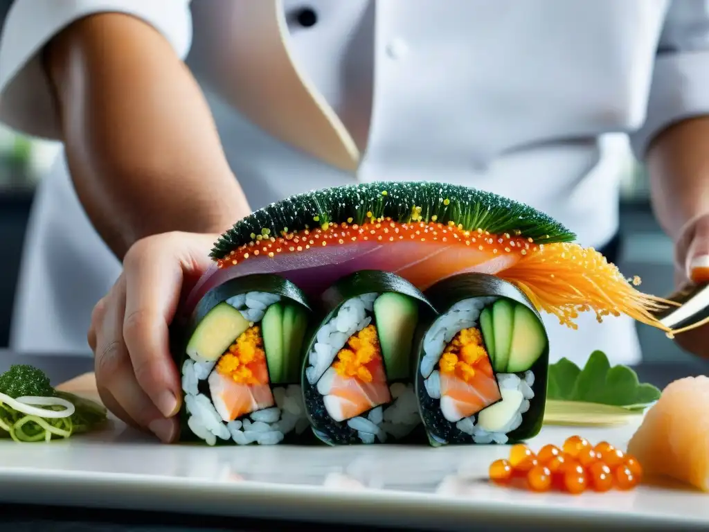 Un chef experto prepara con precisión un sushi exótico con ingredientes marinos