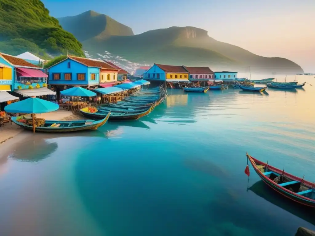 Un espectacular amanecer en un animado pueblo costero, donde pescadores locales comienzan su día junto al mar