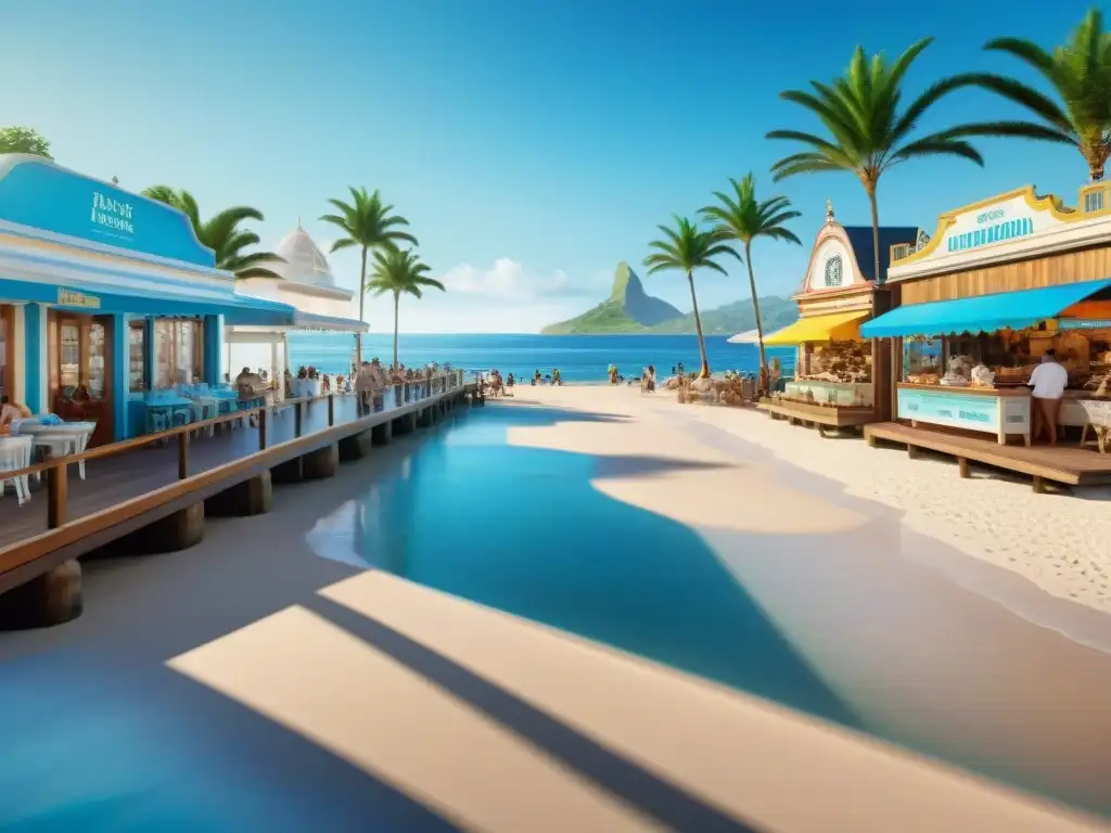 Inversiones en propiedades costeras: Paseo costero bullicioso con coloridas casas de playa y gente relajada