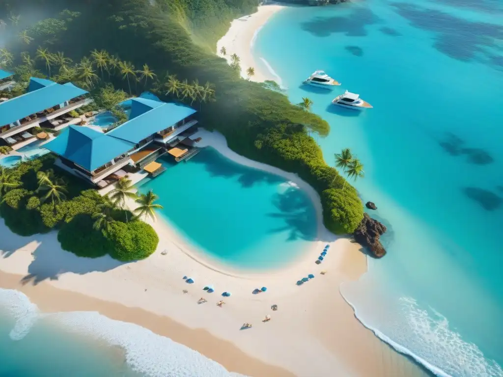 Resort de lujo en la costa con palmeras, playas blancas y aguas turquesas