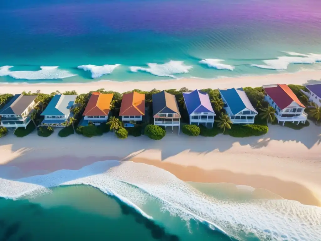 Una fila de lujosas propiedades frente al mar se alinean en una costa arenosa, con aguas turquesas y sol dorado, ideal para inversión y relax