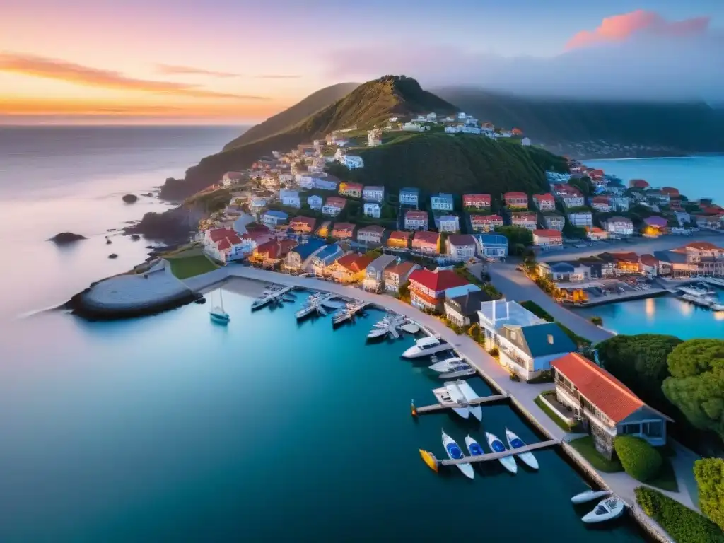 Vista aérea de un lujoso pueblo costero al atardecer, mostrando propiedades frente al mar