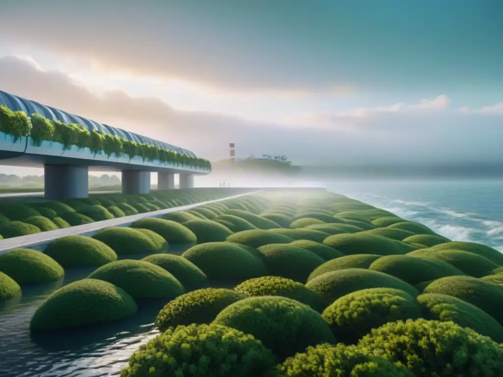 Futurista ciudad costera con innovadoras defensas contra inundaciones, integrada con el entorno marino