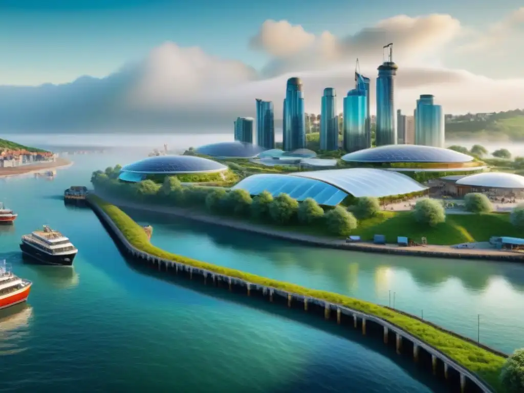 Inversiones sostenibles en el mercado costero: arquitectura futurista, profesionales colaborando y un horizonte marino vibrante