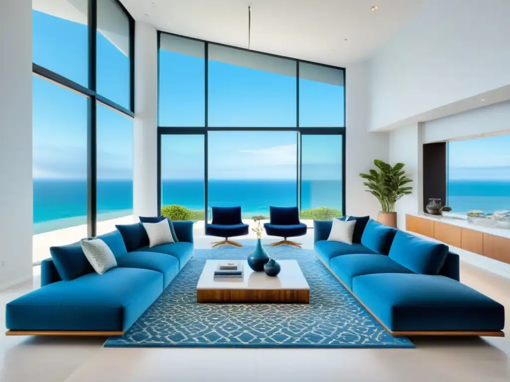 Espléndido salón costero minimalista con muebles de diseñador y vista al mar