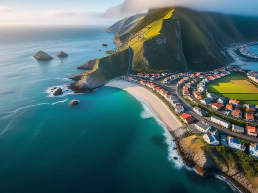 Vista aérea de un pueblo costero con estructuras resistentes a sismos, demostrando seguridad en zonas costeras