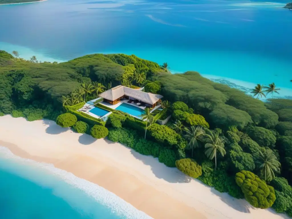 Vista aérea de propiedad costera de lujo con piscinas infinitas y jardines tropicales, ideal para Seguros de lujo para propiedades costeras
