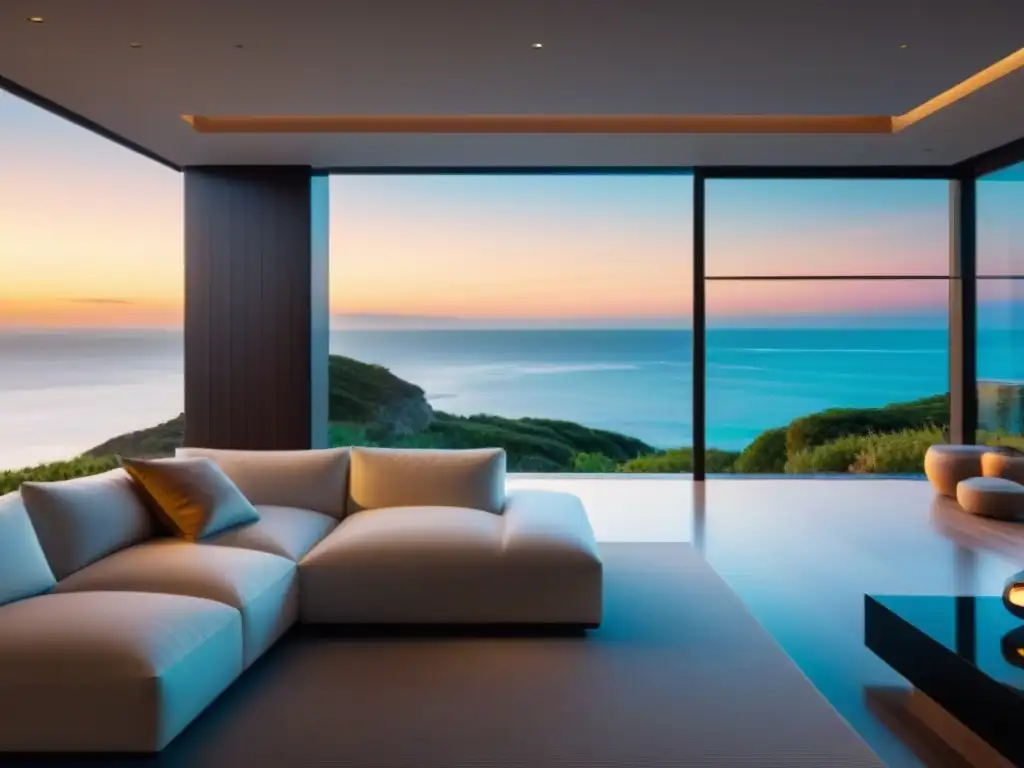 Residencia costera moderna al atardecer con sistemas de seguridad y confort integrados, transmitiendo lujo y tecnología