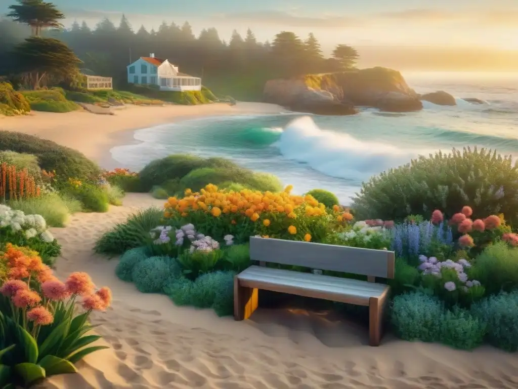 Jardín costero vibrante con plantas resistentes al salitre, seagulls volando y olas rompiendo
