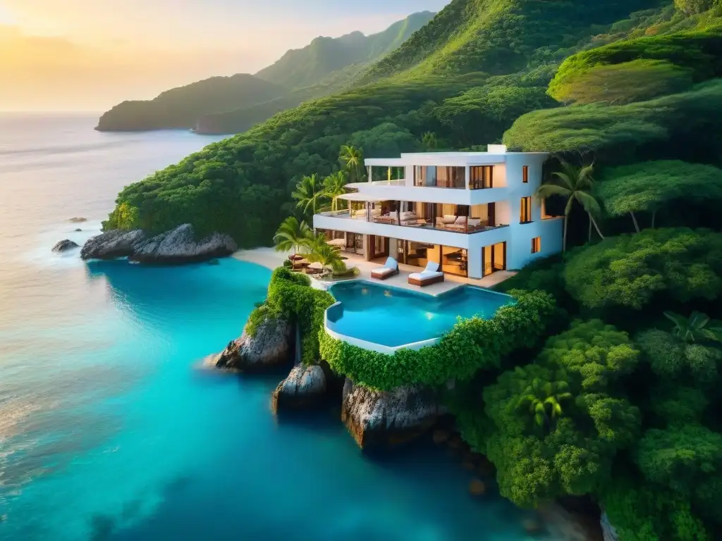 Villa de lujo frente al mar con piscina infinita al atardecer, rodeada de vegetación exuberante